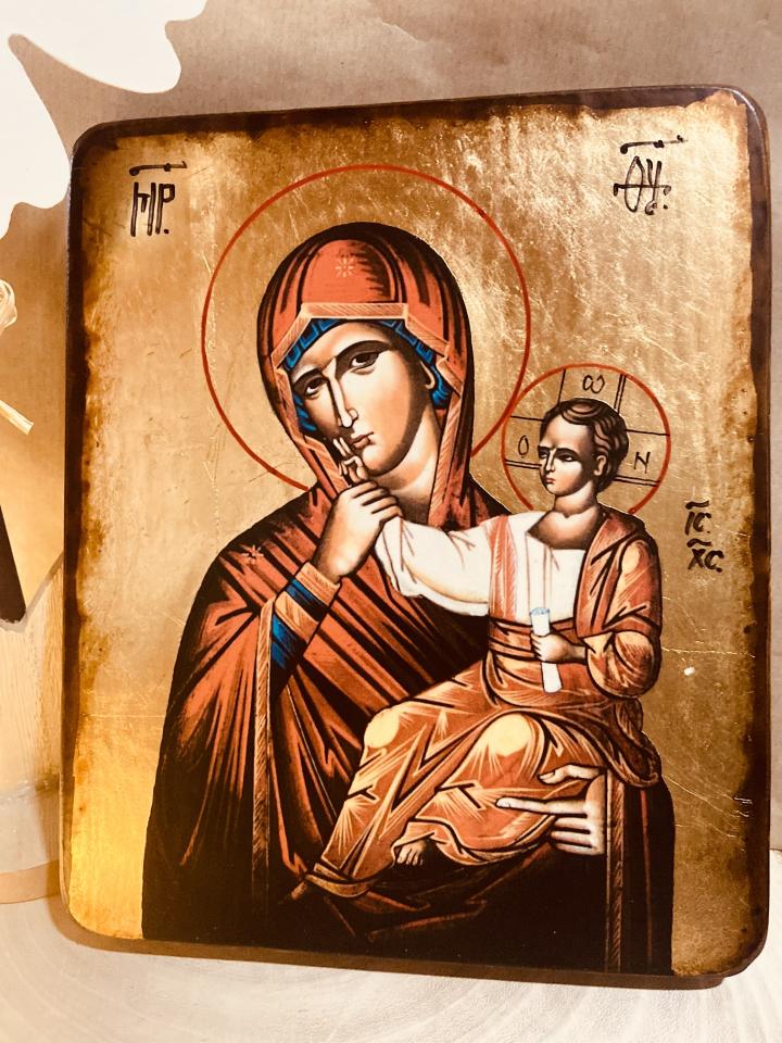Icoana Maicii Domnului Mangaietoarea -Paramithya-lucrata pe lemn masiv cu foita de aur aplicata manual .